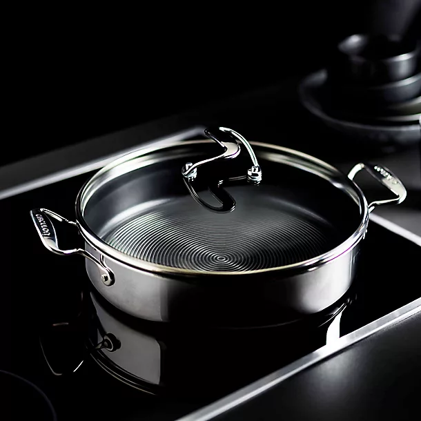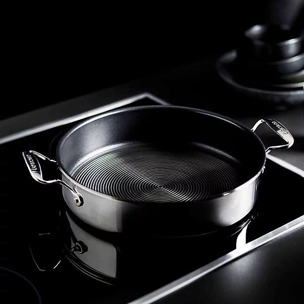 Constructed to last, their tri-ply clad bodies have a responsive pure aluminium core for exceptional temperature control, bonded together with two layers of stainless steel all the way around for unrivalled durability. And with hybrid SteelShield non-stick interiors and highly-polished, mirror-finished exteriors, they look as smart as they cook.